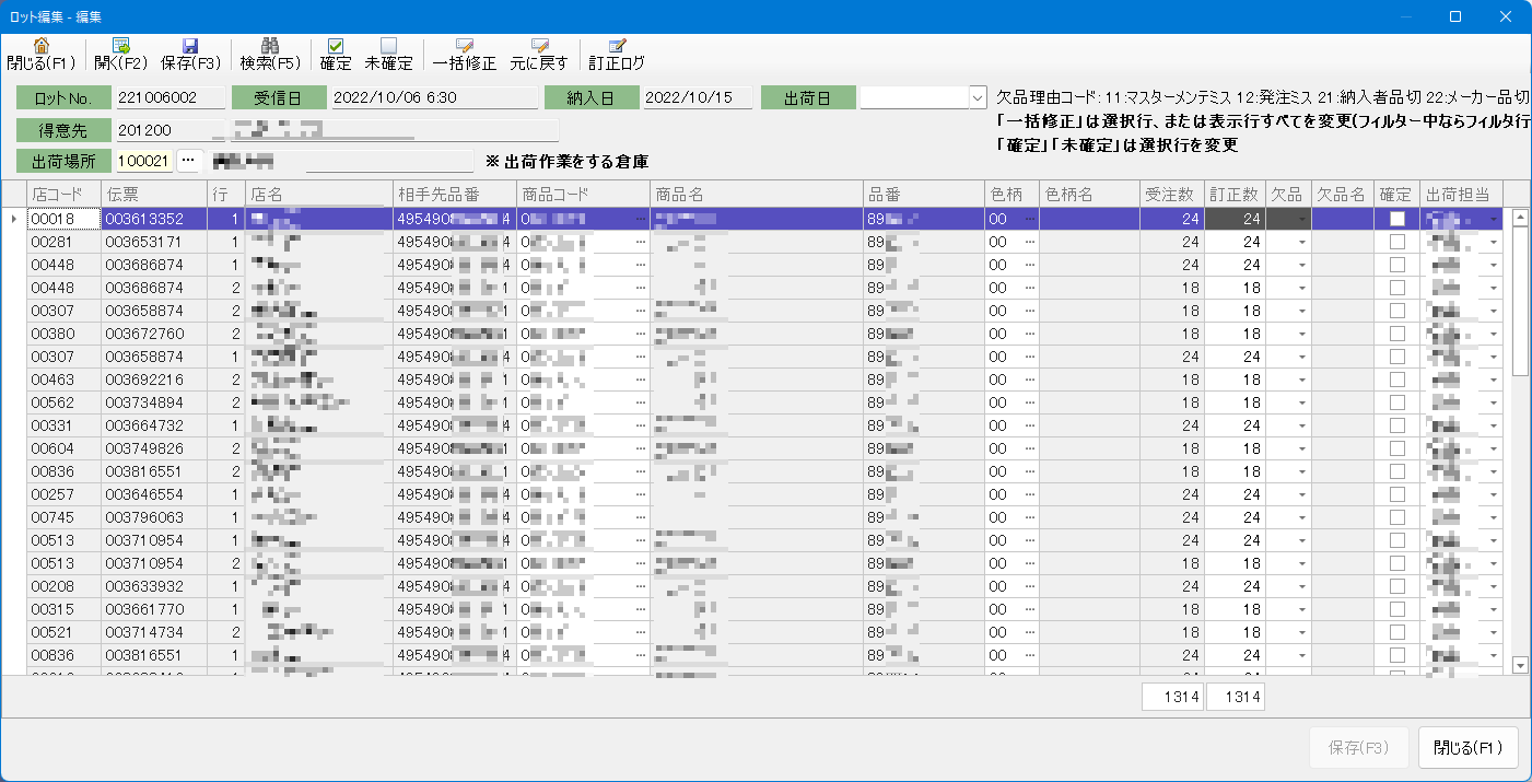 商品行のダブルクリックで商品の受注残・売上データ・発注残・仕入データなどを表示します。
